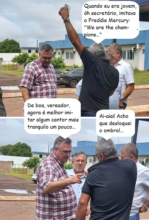 Os cliques são desta sexta-feira, quando o secretário de Estado Beto Preto (Saúde) esteve na Santa Casa de Campo Mourão. Ao se encontrar com o vereador Miltinho do Cidade Nova, ele parece ter feito uma consulta ao ar livre. O prefeito Tauillo Tezelli estava junto. Em tempo: balãozinho à parte, é verdade, sim, que, na juventude, Miltinho fazia dublagens de Freddie Mercury...