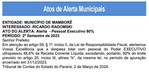 O Tribunal de Contas do Estado publicou alerta, nesta quarta-feira, endereçado ao prefeito Ricardo Radomski. Motivo? O município encerrou o segundo semestre de 2023 comprometendo acima de 48,6% da receita corrente líquida com a folha de pagamento. Não estourou o limite da Lei de Responsabilidade Fiscal, que é 54%, mas o percentual já requer atenção da administração, aí o alertinha ligado.