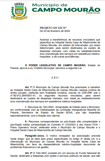 A prefeitura de Campo Mourão enviou para a Câmara projeto de lei autoriza o repasse de recursos para a Santa Casa.