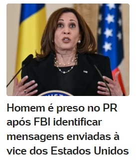Lembra do morador de Juranda que foi preso após mandar mensagens para a vice-presidente dos EUA, Kamala Harris, pedindo a morte de servidores municipais? Virou notícia nacional. Nesta quarta-feira saiu no portal UOL com chamada na página inicial e tudo. Pudera. Até o FBI entrou na parada (foi o órgão norte-americano que interceptou as mensagens e alertou o Ministério da Justiça brasileiro).