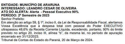 O Tribunal de Contas do Estado publicou nesta terça-feira alerta endereçado ao prefeito de Araruna, Leandro de Oliveira. Motivo? A prefeitura encerrou o ano passado comprometendo acima de 48,6% da receita corrente líquida com a folha de pagamento. Não atingiu o limite da Lei de Responsabilidade Fiscal, que é de 54%, mas já requer atenção da administração.