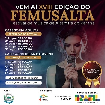 Altamira do Paraná – Ficam abertas até o próximo dia 10 as inscrições para o 18º Femusalta. O festival de música da cidade será no dia 26 de abrul. A premiação, em duas categorias, soma R$ 3 mil.