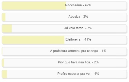 “O que você achou da intervenção da prefeitura na Santa Casa de Campo Mourão?” Enquete encerrada neste domingo deu vitória à alternativa “Necessária”, com 42% dos votos. Mas foi por pouco. Muito pouco. A alternativa “Eleitoreira’ teve 41%. Para 7% a intervenção “Já veio tarde”. O resultado completo está no quadro acima.