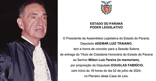 A Assembleia Legislativa vai entregar no próximo dia 2 o título de Cidadão Honorário do Paraná a Milton Luiz Pereira.