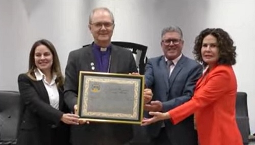 O bispo de Campo Mourão, d. Bruno Versari, recebeu nesta terça-feira o título de Cidadão Honorário do município. Foi durante sessão solene da Câmara com a presença de sete vereadores. A homenagem foi entregue pelo vereador autor, Paulo Pilatte, pela vice-prefeita Fátima Nunes e pela primeira-dama Hosana Tezelli. D. Bruno assumiu a diocese em dezembro de 2017.