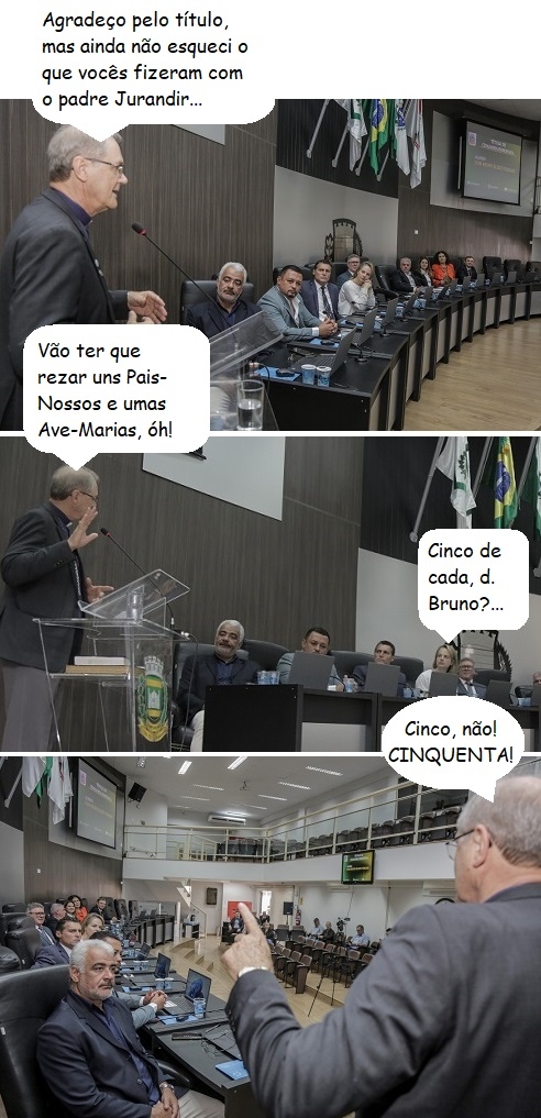 Os cliques são desta terça-feira, quando o bispo d. Bruno Versari foi à Câmara receber o título de Cidadão Honorário de Campo Mourão. Sete vereadores participaram da sessão. Em março, deu o que falar o fato de a Câmara ter rejetado uma Comenda de Honra ao Mérito ao padre Jurandir Aguilar.