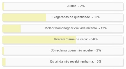 “O que você acha das homenagens aprovadas pela Câmara de Campo Mourão?” Enquete encerrada neste domingo deu vitória à alternativa “Viraram carne de vaca”, com 50% dos votos. “Exagerada na quantidade” ficou em segundo, com 30%. “Melhor homenagear em vida mesmo” teve 13%. O resultado completo está no quadro acima.