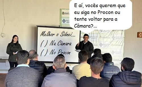 O clic é da reunião do Procon de Campo Mourão com empresas de telefonia e internet, que aconteceu durante a semana. O diretor do Procon, Sidnei Jardim, é recordista de mandatos da Câmara – foram seis entre 1997 e 2020. O balãozinho e o texto no quadro são por conta de Boca Santa...