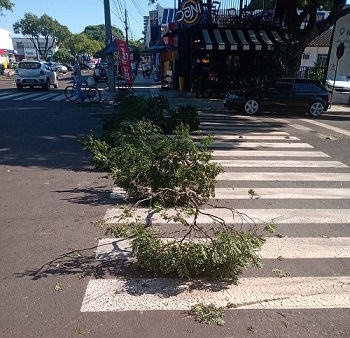 Vendaval no centro de Campo Mourão? Nada disso. É a sinalização, em plena av. Capitão Índio Bandeira, de impedimento de via por causa do corte de uma árvore.