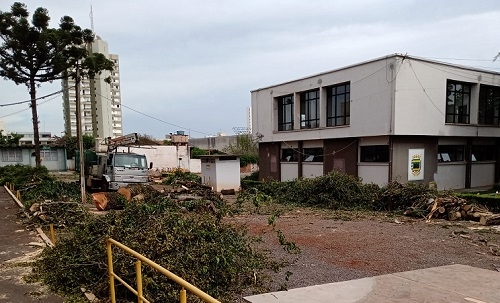 A "serra elétrica" passou afiada pelo estacionamento da prefeitura de Campo Mourão, na rua Brasil. Da várias árvores que existiam no local, só restou uma araucária. O Paço Municipal está fechado para reformas e, nesta quinta-feira, também foi derrubada uma árvore de seu jardim.