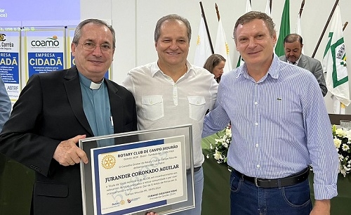 O Rotary de Campo Mourão entregou nesta quinta-feira o título de socio honorário ao padre Jurandir Coronado Aguilar, que por vários anos atuou na cidade, inclusive na Catedral São José. A proposição foi de Osni Menezes. No final de março, a Câmara rejeitou ao mesmo padre o título de Cidadania Honorária. O vereador Escrivão Parma, autor do projeto no legislativo, acompanhou a homenagem do Rotary.