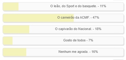 “Qual mascote te agrada mais entre os times de Campo Mourão?” Enquete encerrada neste domingo deu vitória à alternativa “O Carneirão da ACMF”, com 47% dos votos. O “Capivarão do Nacional” ficou em segundo, com 18%. O “Leão do Sport e do basquete” teve 11%. O resultado completo está no quadro acima.