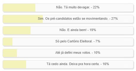 “Já deu para perceber que estamos em ano de eleições municipais?” Enquete encerrada neste domingo deu vitória à alternativa “Sim. Os pré-candidatos já estão se movimentando”, com 27% dos votos. “Não. Tá muito devagar” apareceu em segundo, com 22%. Já “Não. E ainda bem” ficou em terceiro, com 19%. O resultado completo está no quadro acima.