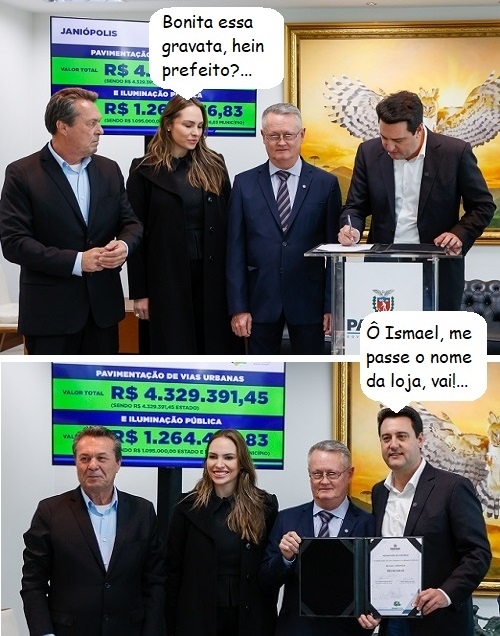 Os cliques são desta terça-feira, em Curitiba, quando o governador Ratinho Jr anunciou a liberação de recursos para construção de asfalto em Janiópolis. O prefeito Ismael Dezanoski é o único que aparece de gravata entre o governador e o secretário Marcio Nunes (Turismo), além da deputada Maria Victoria, é claro.