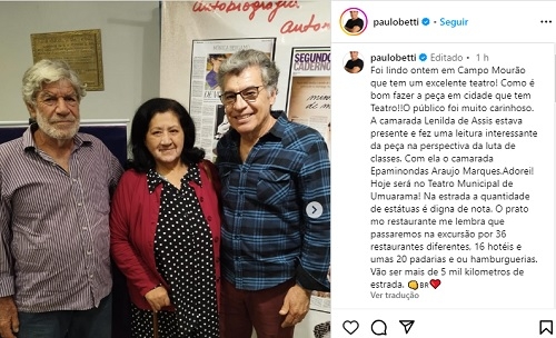 Olha a foto que o ator Paulo Betti postou no Instagram. Sim, ele ao lado da presidente do Conselho Municipal de Saúde, Lenilda de Assis, e de Epaminondas Marques. Betti se apresentou segunda-feira em Campo Mourão. “A camarada Lenilda de Assis estava presente e fez uma leitura interessante da peça na perspectiva da luta de classes”, escreveu o artista.