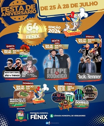 Saiu a programação de aniversário de 64 anos de Fênix. A comemoração será de 25 a 28 de julho. Começa na quinta-feira, com show com a dupla Jão & Thiago e cantora Clara Faria. Na sexta tem a dupla Felipe & Rodrigo e, no sábado, Rick & Renner. Tudo com entrada franca. No último dia será servido o prato típico Peixe na Cerâmica.