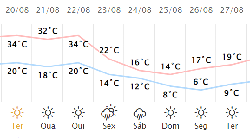 Tá quente, hein? Pois fique sabendo que a temperatura segue acima dos 30 graus até quinta-feira em Campo Mourão. Na sexta chove 9,7 mm e a máxima cai para 22 graus. No sábado chove mais (38 mm) e os termômetros não passam de 16 graus. No domingo fica entre 6 e 17 graus e a partir de segunda começa a esquentar novamente. A previsão é do Simepar.