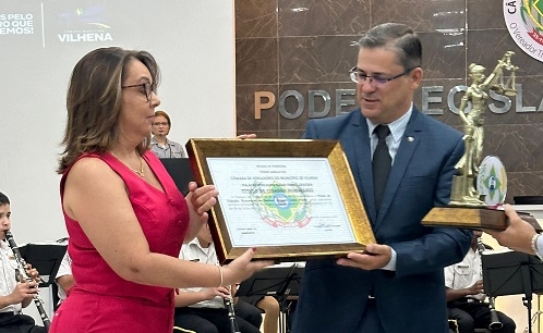 O juiz de direito Adriano Lima Toldo, de Rondônia, recebeu nesta terça-feira o título de Cidadão Honorário de Vilhena/RO. A homenagem partiu do vereador Sargento Damassa “pelos relevantes serviços prestados ao município”. Atualmente em Ji-Paraná, Toldo foi juiz em Vilhena por 10 anos. Detalhe: ele é de Campo Mourão, onde foi advogado até 2005. Antes de concluir o curso de direito já trabalhava no fórum mourãoense.