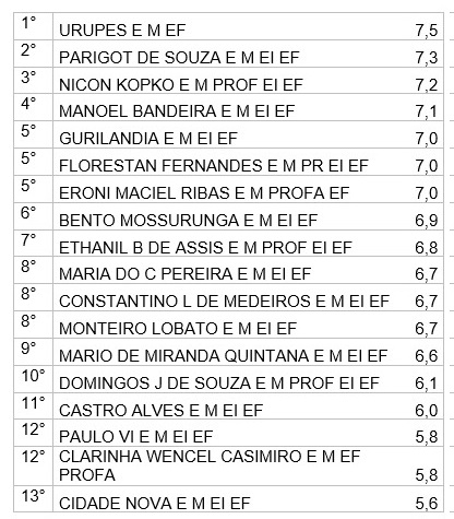 Na terceira posição regional também há empate entre Boa Esperança e Ubiratã, ambos com 7,6.