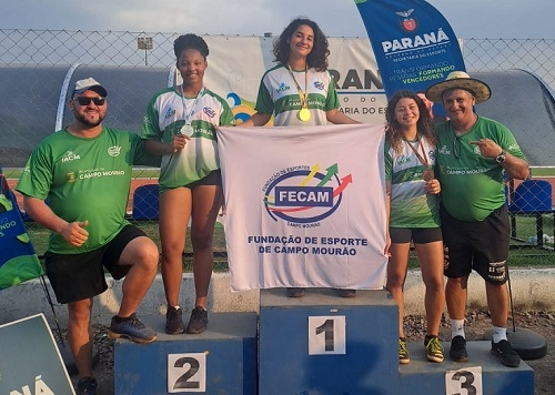 Foto histórica nos Jogos da Juventude do Paraná, que estão sendo disputados em Campo Mourão. No pódio do lançamento do martelo feminino, só deu atleta mourãoense. Ouro para Jade Vieira (recorde dos Jojup’s), prata para Maria Ruth e bronze para Letícia Dominelli.