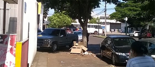 “Caminhonete estaciona sobre a calçada, numa boa, no centro de Campo Mourão. O flagrante foi feito sexta-feira, na av. Manoel Mendes de Camargo, entre as ruas São Josafat e Edmundo Mercer”.