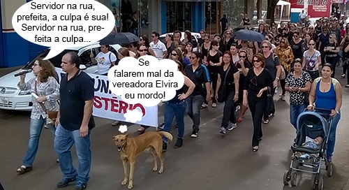 O clic é desta quinta-feira, quando servidores municipais em greve fizeram mais uma passeata pelas avenidas centrais de Campo Mourão. Desta vez com quase todo mundo de preto. E com um simpático vira-latas acompanhando a comissão de frente. Ah, esses “representantes" da vereadora Elvira estão em todas...
