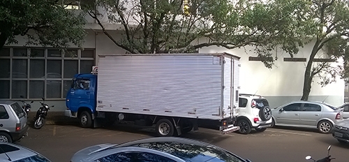 “Caminhão estaciona no centro de Campo Mourão (rua Harrison José Borges), na manhã desta segunda-feira. Erro 1: a traseira do caminhão fechou metade da rua. Erro 2: a vaga é destinada a pessoas com deficiência”.