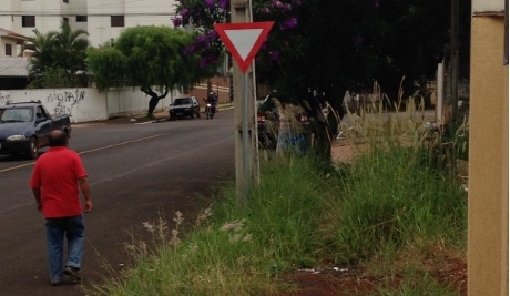 "Na rua Roberto Brzezinski, quase esquina com av. José Custódio de Oliveira, o pedestre tem que passar pelo meio da rua mesmo. Veja que ele obedeceu a placa e parou pro mato passar". Adriano