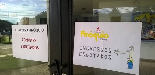 Quem conseguiu o ingresso para ver o Concurso Pinóquio desta noite, conseguiu. Quem não conseguiu não consegue mais. Todos os convites foram distribuídos nesta terça-feira. Quem foi ao Teatro Municipal na manhã desta quarta-feira já se deparou com esse aviso na porta. Portanto, acabou-se o que era doce. E ô povo pra gostar de uma mentirinha, hein?...