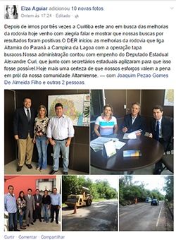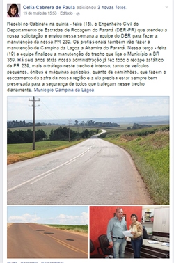Tanto Elza Aguiar (Altamira do Paraná) quanto Célia Cabrera (Campina da Lagoa) postaram no Facebook que as obras começaram esta semana após cobranças delas no governo.