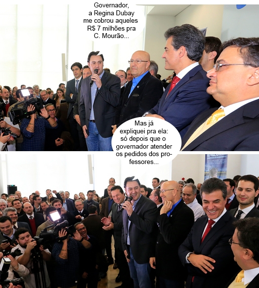 Olha aí mais cliques da cerimônia do início da semana, em Curitiba, quando o governo do Estado anunciou a liberação de recursos para vários municípios. O secretário de Estado Ratinho Jr (Desenvolvimento Urbano) discursa e leva todo mundo a sorrir. Ainda não saíram os R$ 7 milhões para Campo Mourão, mas, como diz o ditado: "Quem ri por último, ri melhor"...