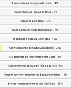 Lavar o carro na barragem da usina tem 14% e almoçar nas churrasqueiras do Bosque Municipal, 11%.