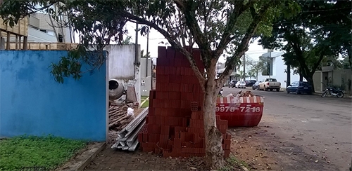 Rua Rocha Pombo, área central de Campo Mourão. Na calçada, o material de construção ocupou todo o espaço. Na beira da meio fio ficou a caçamba. Portanto, para o pedestre só restou o meio da rua”.