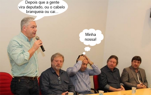 O secretário de Estado Douglas Fabrício (Esporte e Turismo) discursa durante a reunião da Comcam, na última sexta-feira. O presidente da entidade, Bento Batista (Juranda) está ao lado. Agora, repare no deputado Márcio Nunes. O que será que Douglas pro Márcio ir com às mãos à cabeça, desse jeito?...