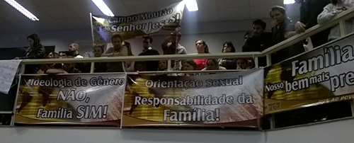 Várias pessoas levaram faixas e cartazes contra a “ideologia do gênero”, que estaria “disfarçada de gênero” na tal meta 12.