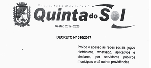 Funcionários da prefeitura de Quinta do Sol não podem mais acessar as redes sociais durante o horário de expediente.