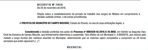 Coincidência ou não, a mesma edição do “Órgão Oficial” que trouxe o decreto do horário médico, publicou portaria com pedido de demissão de médico clínico geral. Na época da aprovação da lei, a Secretaria de Saúde alegou que os médicos deixariam prefeitura se a carga horária não fosse reduzida.