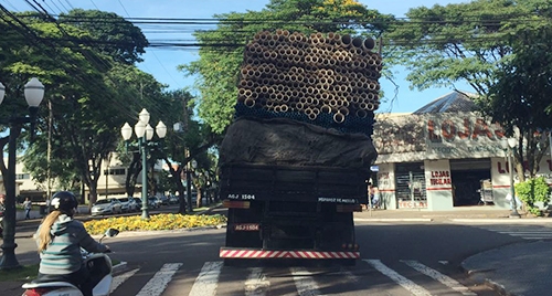 Caminhão passando pelo centro de Campo Mourão é “carne de vaca”. Agora, reparou na carga desse dai, passando pela av. Manoel Mendes de Camargo, bem em frente à prefeitura? Tá torta, não tá?...