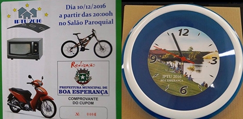 Morador de Boa Esperança que pagou o IPTU deste ano tem direito a um relógio de parede. O brinde está sendo entregue desde o final de outubro para quem apresentar o carnê quitado na prefeitura. Além do relégio, o contribuinte em dia ganha um cupom para concorrer a prêmios. A prefeitura vai sortear uma moto, uma bicicleta e um forno no próximo dia 12 (20h).