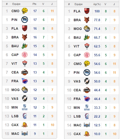 Com 11 partidas, Campo Mourão e Pinheiros são os times que mais jogaram até agora. O Flamengo, por exemplo, tem oito jogos. Por isso mesmo, leva-se mais em conta a classificação por aproveitamento, onde os mourãoenes estão em sétimo lugar, com 54,6%. O Mengão lidera com 100%. Confira acima as duas classificações.