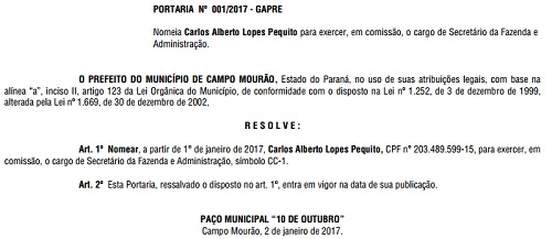 O secretário da Fazenda, Beto Pequito, foi o primeiro cargo em comissão nomeado pelo prefeito Tauillo Tezelli. A portaria 01/2017 foi publicada nesta segunda-feira, primeiro dia de trabalho da nova administração. Além dele, apenas Rosimeire Martelo foi nomeada como secretária da Saúde. Meire é enfermeira de carreira da prefeitura.