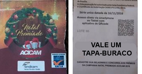 Não tinha nas “seladinhas” deste ano, mas se tivesse teria feito o maior sucesso. Que tal concorrer a tapa-buraco em frente de casa na hora de fazer as compras? Fica aí a sugestão para as próximas promoções. Se que é os buracos ainda estarão por aí, né?...