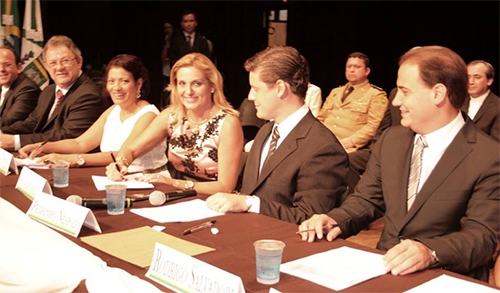 1º de janeiro de 2013. Regina Dubay assina o a posse como prefeita de Campo Mourão, em solenidade no Teatro Municipal. À esquerda dela, o vereador Pedrinho Nespolo, que tinha sido eleito presidente da Câmara, e o vice-prefeito Rodrigo Salvadori. Do outro lado, os vereadores Professora Vilma, Edson Battilani e Luiz Alfredo.