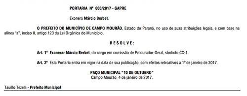 Márcio Berbet (Procuradoria Geral) e Altair Casarim (Previscam) tiveram exonerações assinadas pelo prefeito Tauillo Tezelli.