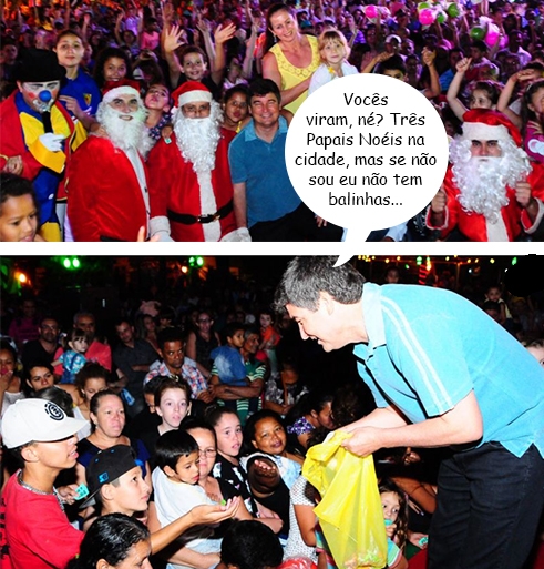 Tá certo que o Natal já passou, mas chegada de Papai Noel com três “bons velhinhos” ainda merece registro, não merece? Isso aconteceu em Terra Boa. Os trio de Papais Noéis chegou num Fusca conversível, que desfilou pela cidade. Mesmo assim o prefeito Valter Peres deu uma mãozinha na hora da distribuição das balas.