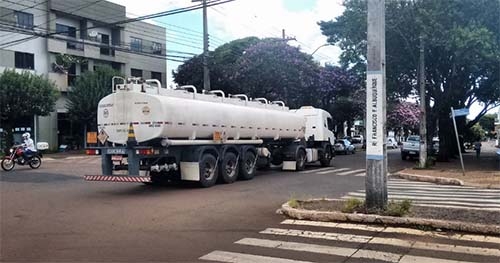Carreta cruz a rua Francisco Albuquerque, na av. Irmãos Pereira, por volta das 16h30 desta segunda-feira, no centro de Campo Mourão.