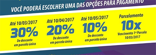 Recebeu o boleto do IPTU de Campo Mourão que prevê desconto de 8% de pagamento á vista? Então morra de inveja, porque em Peabiru quem pagar o imposto à vista até 10 de março terá 30% de desconto. E ainda tem segunda chance. São 20% de desconto para quem pagar até 10 de abril. Quer mais? Pois saiba que pagamento o IPTU até 10 de maio garante abatimento de 10%. Agora, para quem preferir suaves prestações mensais, tem a opção de parcelar em 10 vezes, a partir de março.