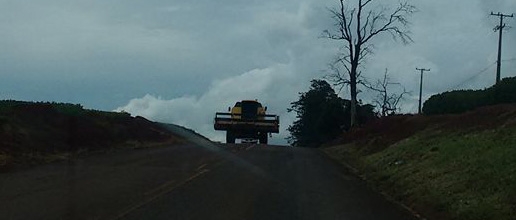 Colheitadeira trafega pela PR-558, entre Terra Boa e o distrito de Malu, tomando conta de toda a pista.