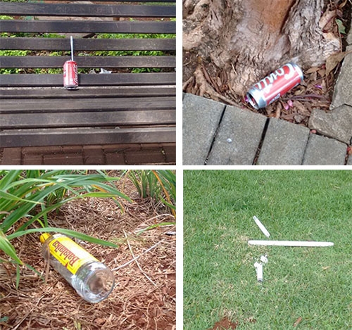 As quatro fotos acima foram feitas nas praças São José e Getúlio Vargas, no centro de Campo Mourão. Além do lixo fora do lugar, elas têm algo em comum: nem a lata de refrigerante no banco, nem a lata de cerveja no pé da árvore, nem o litro de vodca no jardim, nem a lâmpada no gramado foram parar sozinhos nesses locais. Alguém jogou ou deixou tudo isso onde não devia, mesmo havendo lixeiras por perto.