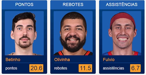 ...Betinho, de Campo Mourão! Ele tem uma média de 20,62 pontos por partida. A foto dele está no portal da Liga Nacional de Basquete entre os “destaques da temporada”. Marquinhos, do Flamengo, vem em segundo lugar, com 20,38. Betinho também está em primeiro lugar em lances livres convertidos. Outro jogador de Campo Mourão, Douglas Nunes, é líder em tocos.